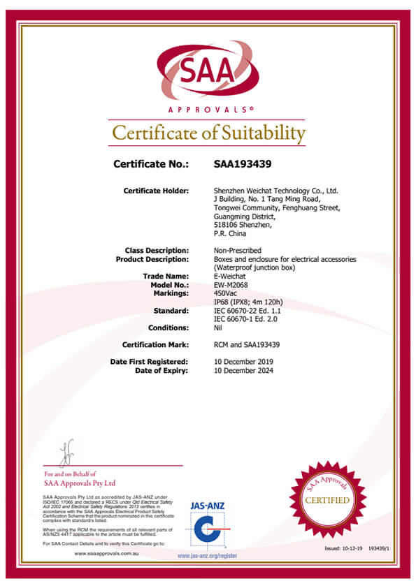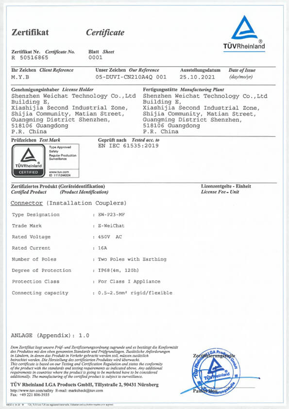 EW LP20 device waterproof connector, the technical performance complies with international standards such as UL and TUV. The product boasts an IP68 IP Rating, delivering advanced waterproofing performance and robust protection for harsh, water-exposed environments.