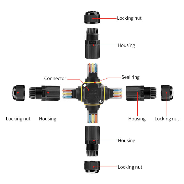 Wiring Mode:Screwless Type Pins:3 pins Material:Plastic Rated Current:24A Rated Voltage:250V Protection Level:IP68 |